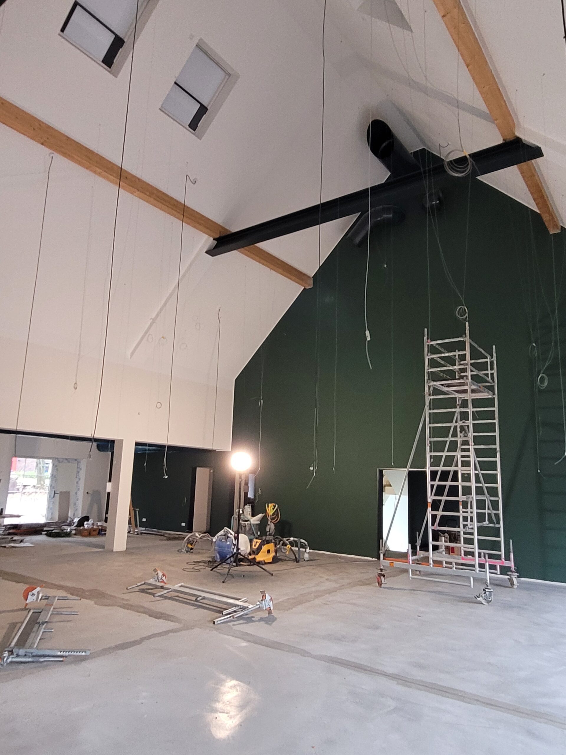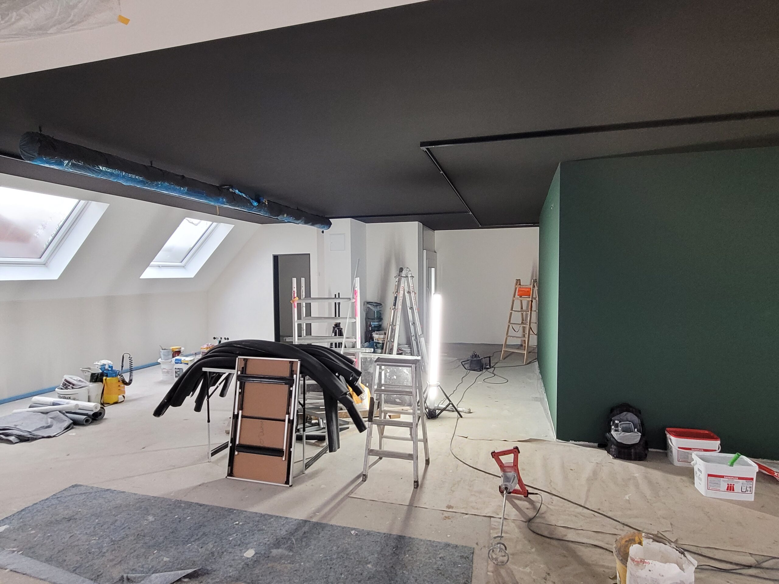 Die Trockenbauleistungen sind vollständig abgeschlossen und bilden nun eine solide Grundlage für die folgenden Ausbaugewerke. Auch die Malerarbeiten stehen kurz vor dem Abschluss: Decken und Wände in den Gastronomiebereichen sowie im Saal wurden äußerst ansprechend gestaltet und vermitteln bereits jetzt ein hochwertiges, einladendes Ambiente.