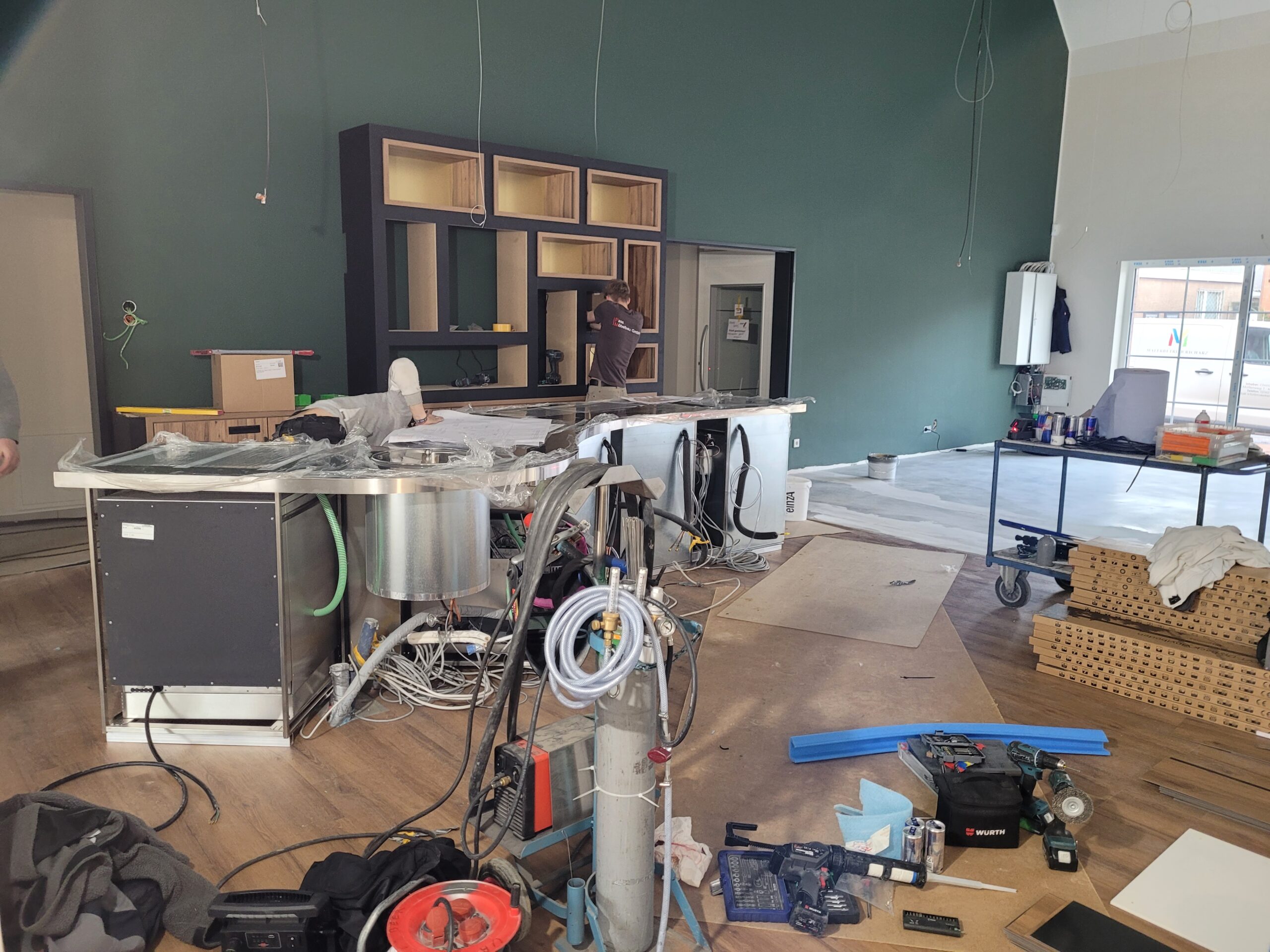 Im Erdgeschoss haben parallel die Oberbodenarbeiten begonnen. Der Vinylbelag im Gastraum ist bereits fertig verlegt und verleiht dem Raum ein harmonisches Gesamtbild. Im Saal konnte der Boden im Bereich der künftigen Thekenanlage ebenfalls erfolgreich eingebracht werden. Direkt im Anschluss erfolgte die Montage der Theke im Gastraum, die nun vollständig steht. Die Thekenanlage im Saal befindet sich derzeit im Aufbau und nimmt zunehmend Gestalt an.