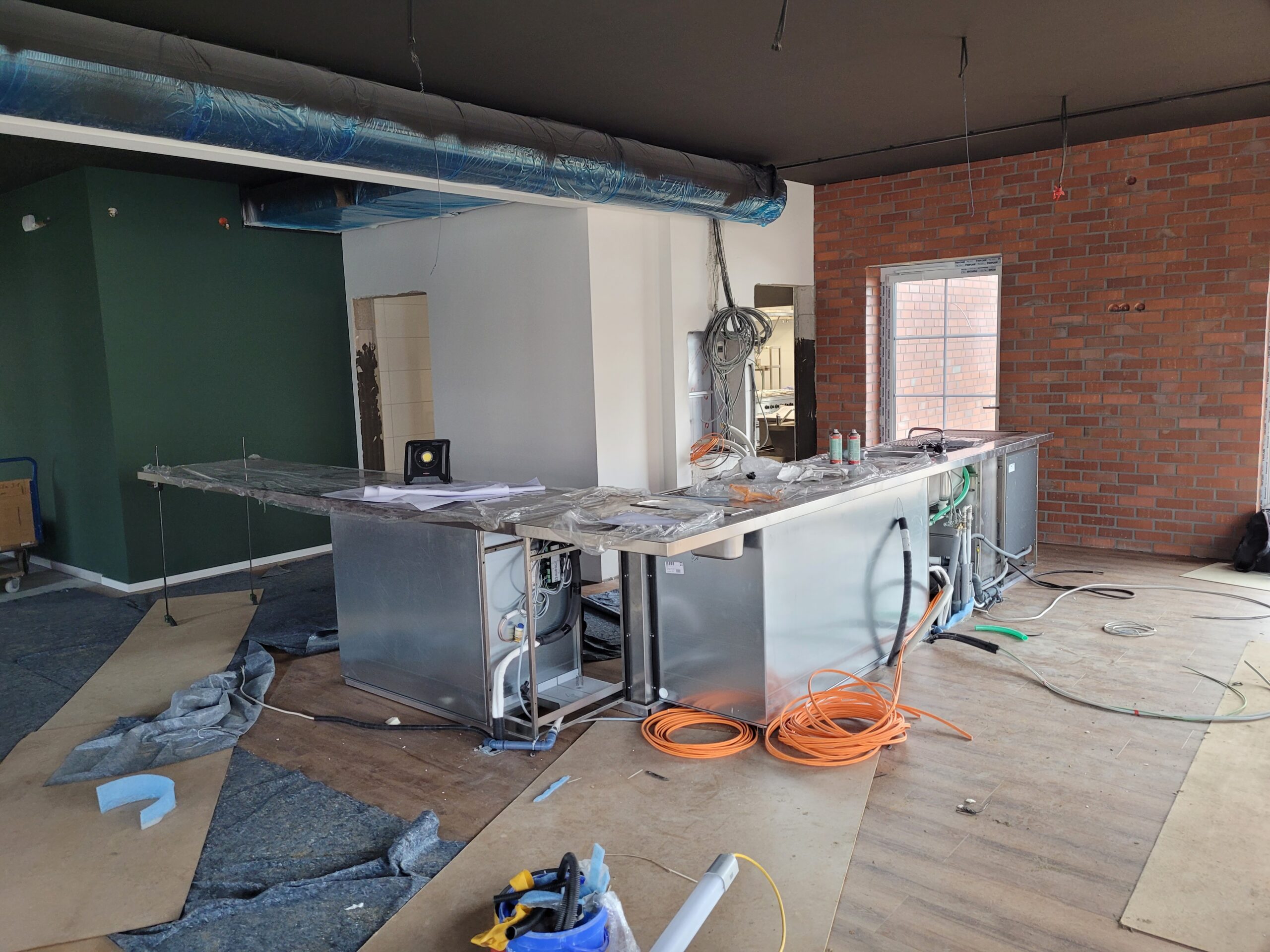 Die Küche wurde bereits vollständig montiert und ist somit betriebsbereit ausgestattet. Begleitend zu allen Gewerken laufen weiterhin die erforderlichen Elektroinstallationen, die den technischen Ausbau sicherstellen. Zudem wurde im Gastraum die neue Beleuchtung installiert, wodurch die Atmosphäre des Raumes bereits deutlich spürbar wird.